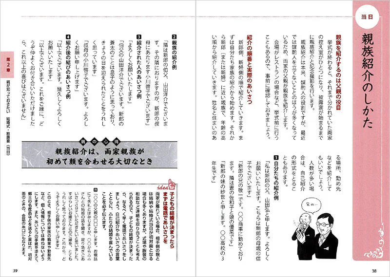 大切な子どもの結婚式。最大限の祝福をしたい。そして、ゲストにも「これまで支えてくださってありがとうございます」「今後ともよろしくお願いします」という気持ちを伝えたい……。本書は、これらの親として当然の願いをかなえるための一冊です。本人もゲストも満足するすばらしい結婚式にするための「準備」と「ふるまい」についてていねいに解説し、「両家代表のあいさつ」については、自分の言葉で感謝の気持ちを伝えられるよう、たくさんの文例とその言い換え例を用意しました。
