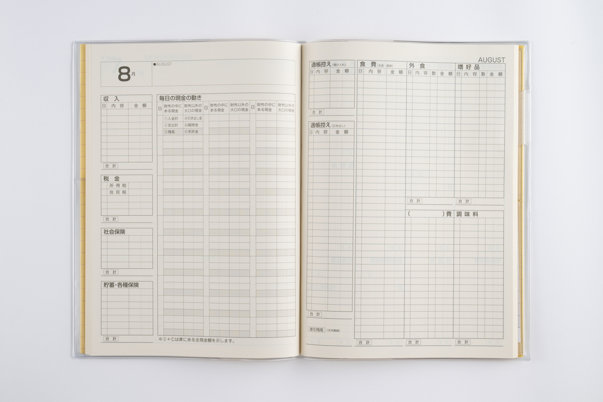 「食費」「外食費」など何にどれだけ使ったか、費目ごとに1ヵ月の収支を手早く把握。日記帳としても活用できるメモスペース付きです。レシートやカード等をスッキリ収納できる特製フリーポケット付き。ペンホルダー付き。