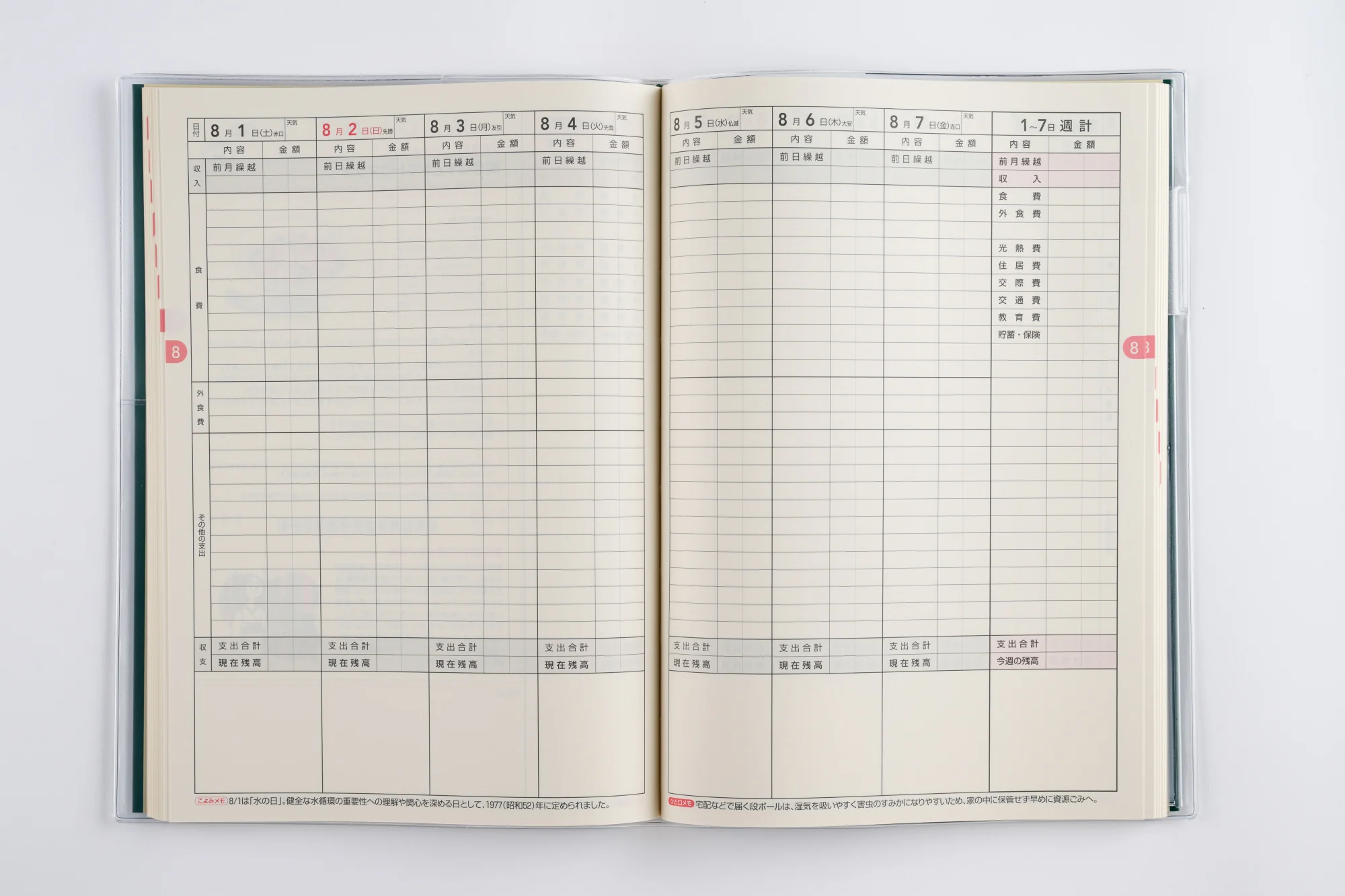 家計簿の中でも王道の週計タイプは、1日ごと・週ごとの収支を管理するのに便利。費目を大きく食費、外食、その他の支出に分けてあるので、忙しい方でも簡単につけられます。レシートやカード等をスッキリ収納できる特製フリーポケット付き。ペンホルダー付き。