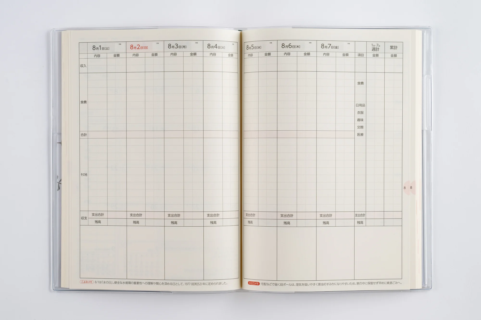 家計簿の中でも王道の週計タイプ。シンプルな構成で、初めて家計簿をつける方にもおすすめ。基本的な費目以外は自由に決められます。レシートやカード等をスッキリ収納できる特製フリーポケット付き。ペンホルダー付き。