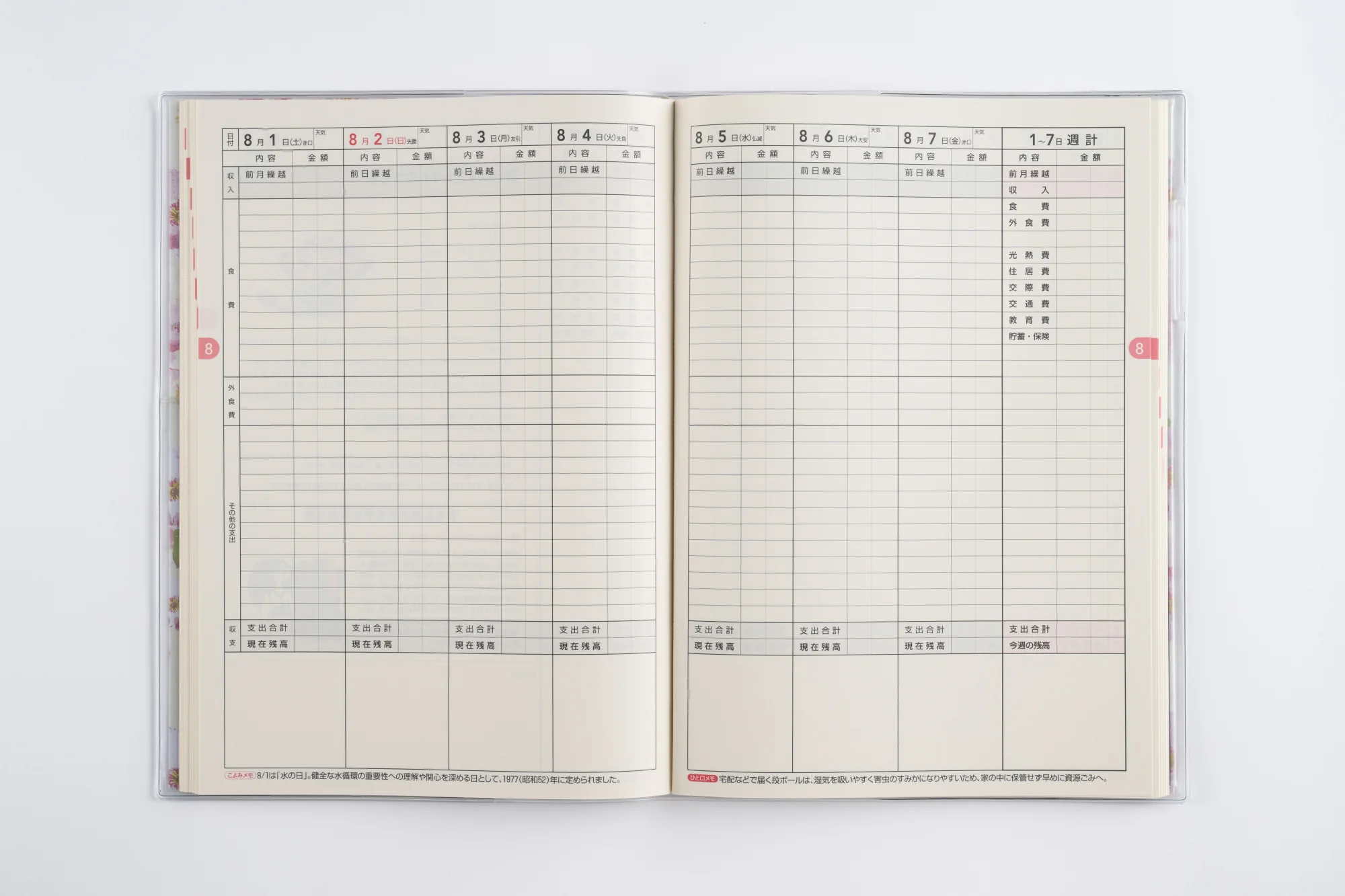 家計簿の中でも王道の週計タイプは、1日ごと・週ごとの収支を管理するのに便利。費目を大きく食費、外食、その他の支出に分けてあるので、忙しい方でも簡単につけられます。レシートやカード等をスッキリ収納できる特製フリーポケット付き。ペンホルダー付き。