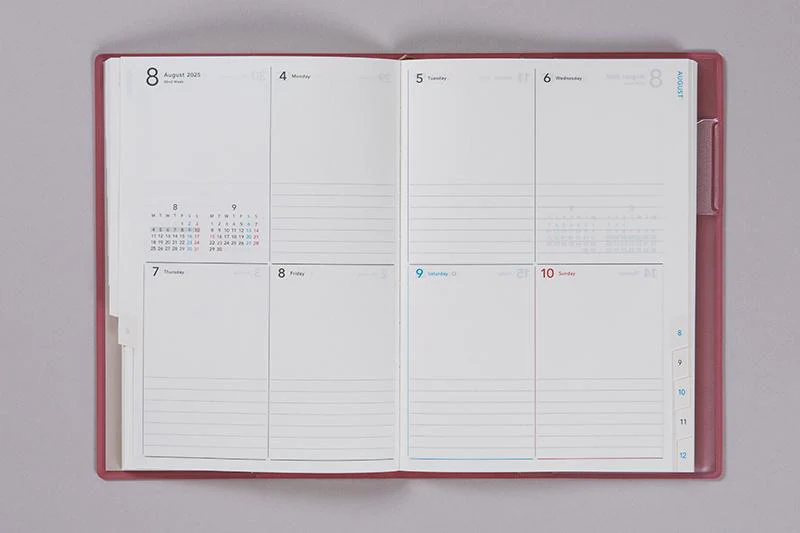 1日ごとの記入スペースが広い週間ブロック式は、ライフログやイラストなど、思いのままに記入ができます。ビジネスユースにもおすすめ。