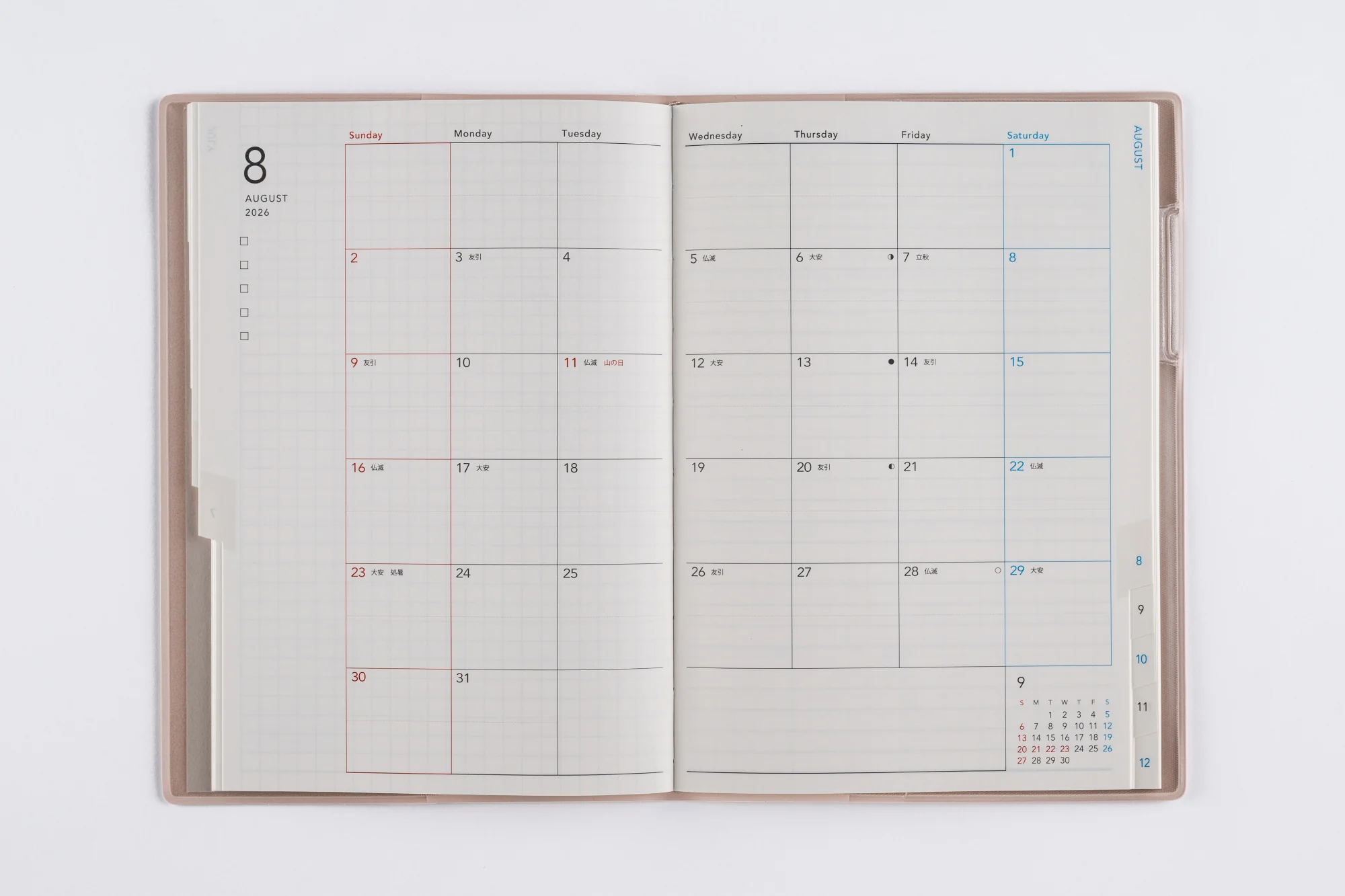 月間ページとメモページのみのシンプルな手帳。ベーシックなB6判は、予定をしっかり書き残したい方におすすめ。月別インデックス付き。