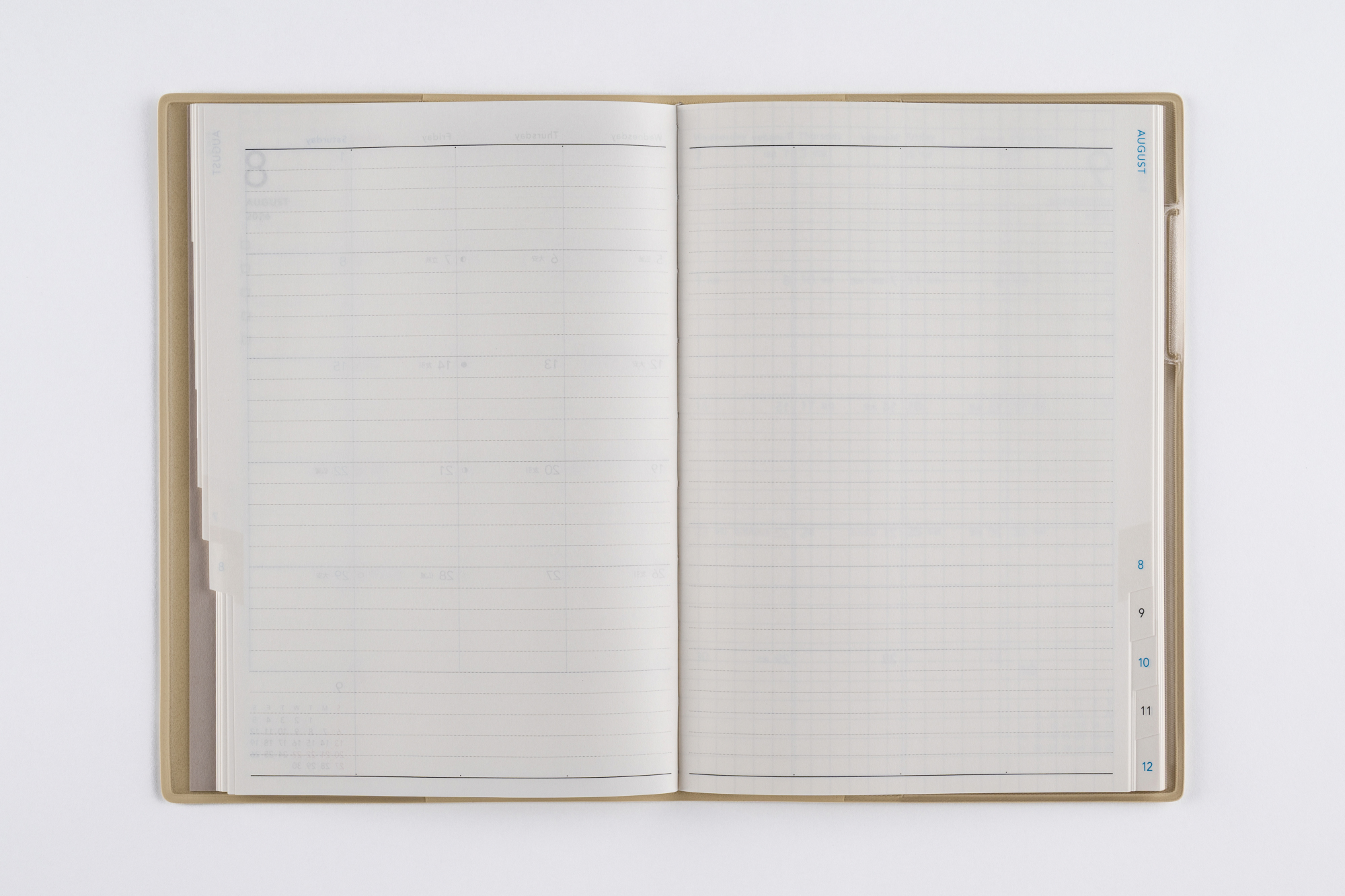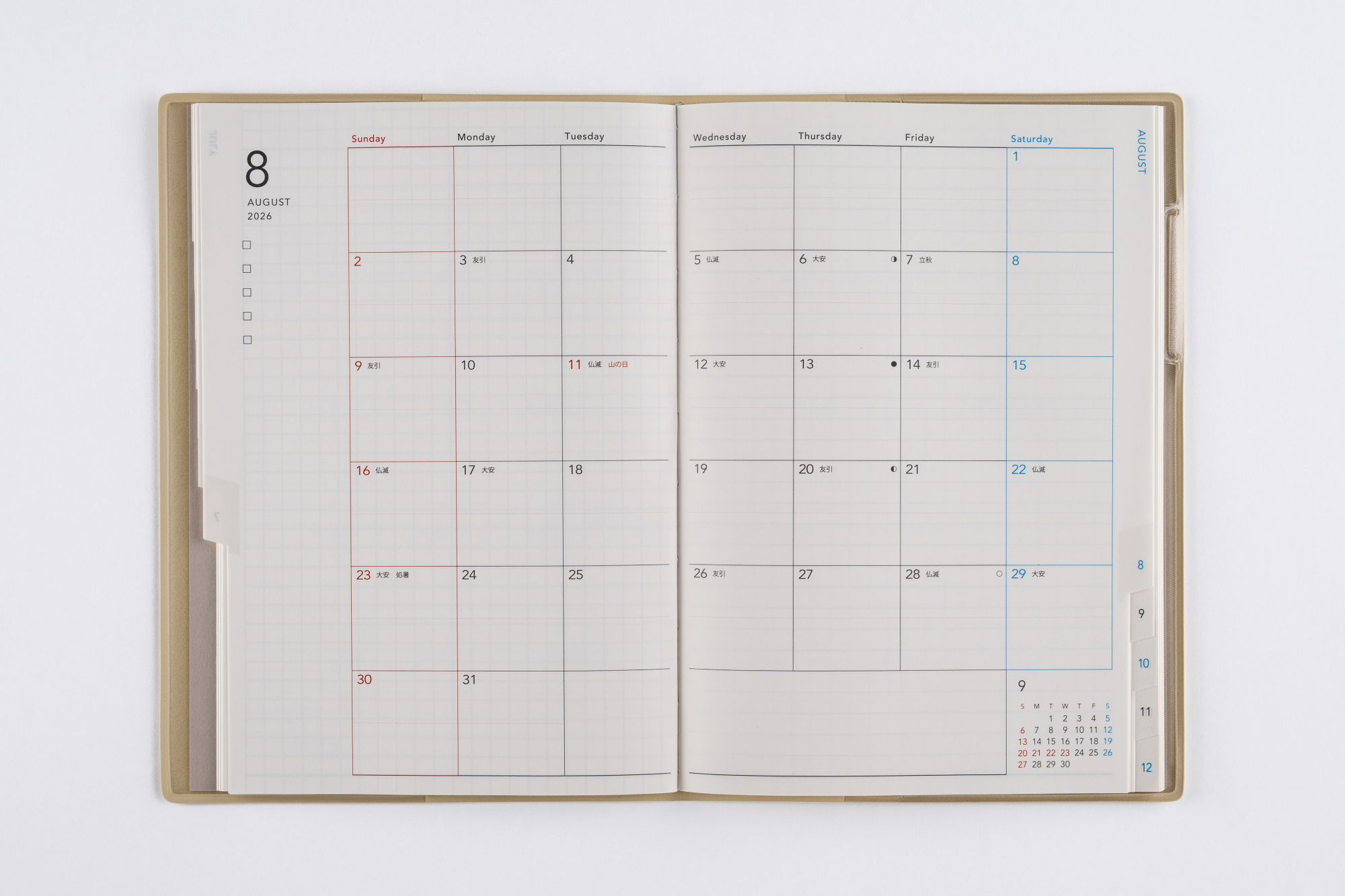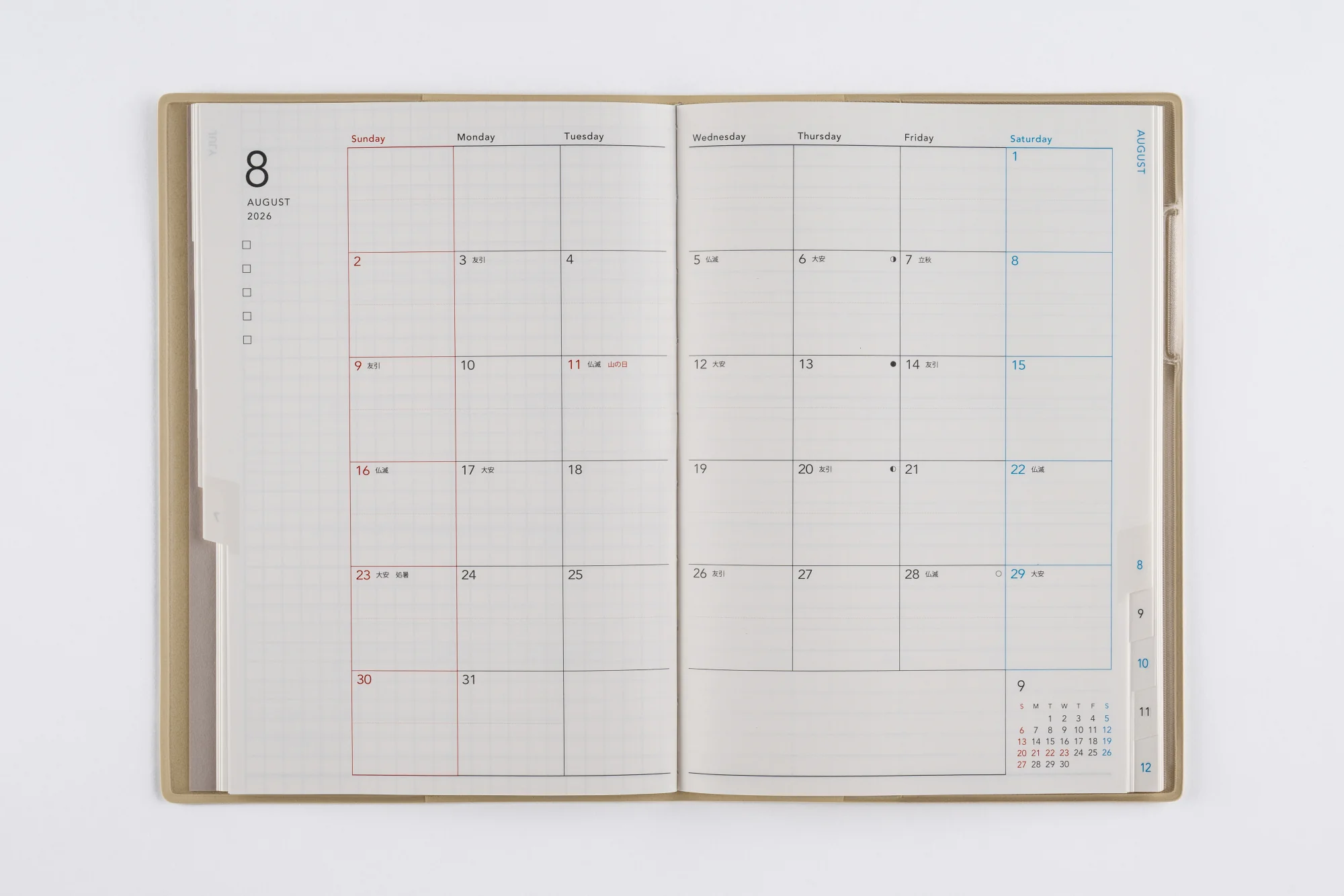 月間ページとメモページのみのシンプルな手帳。ベーシックなB6判は、予定をしっかり書き残したい方におすすめ。月別インデックス付き。