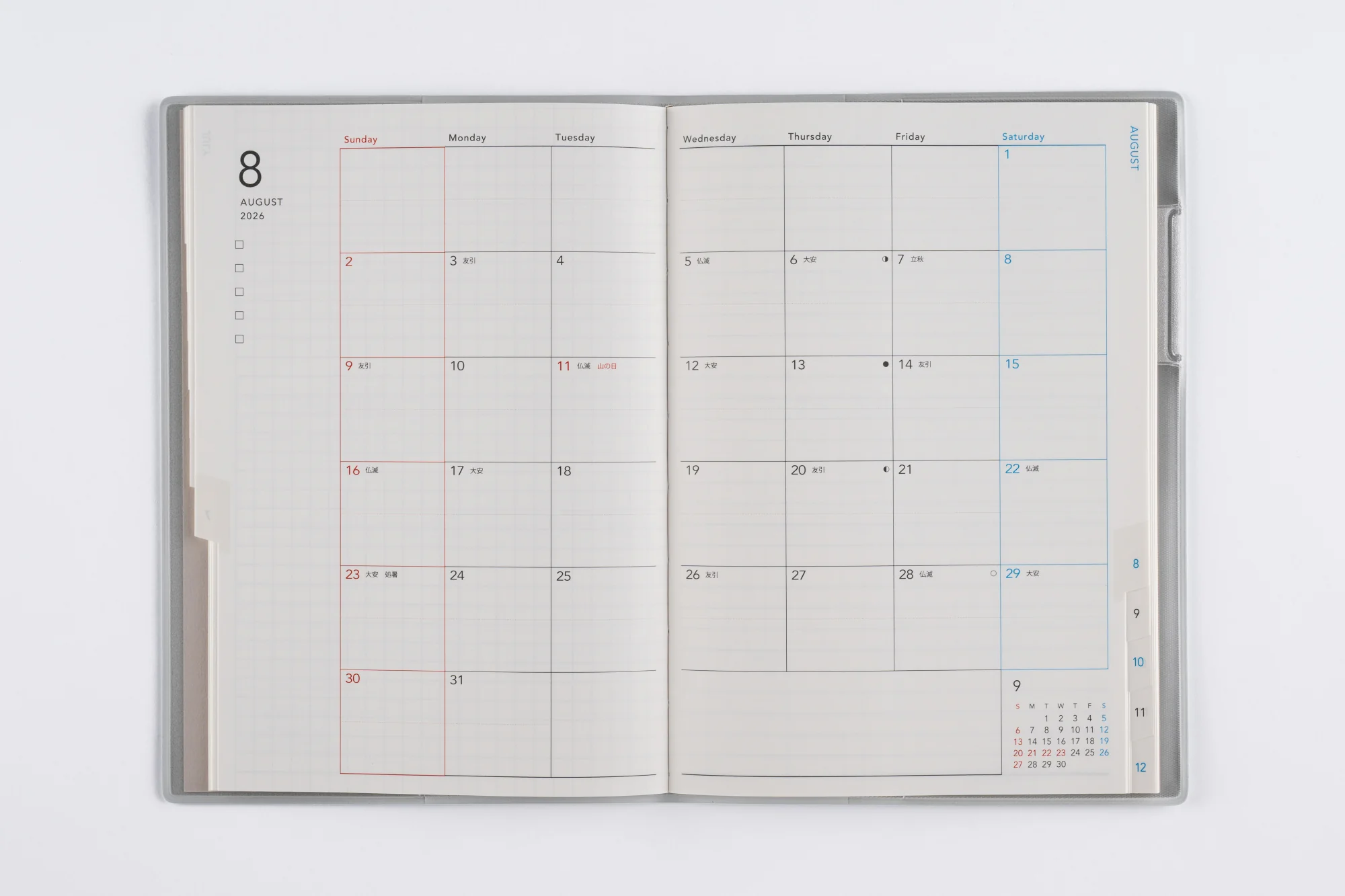 月間ページとメモページのみのシンプルな手帳。ベーシックなB6判は、予定をしっかり書き残したい方におすすめ。月別インデックス付き。