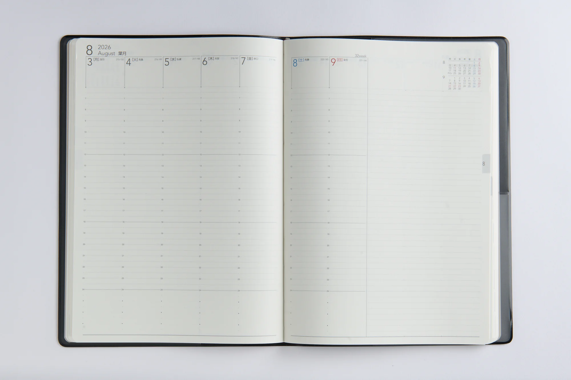 ベーシックな黒色のカバーで、ビジネスシーンでも使いやすい1冊です。日々の時間管理がしやすいバーティカル式。おしゃれでさりげない銀色の箔押しもワンポイント。白色の用紙を使用しているため、予定を色別で管理しやすい!