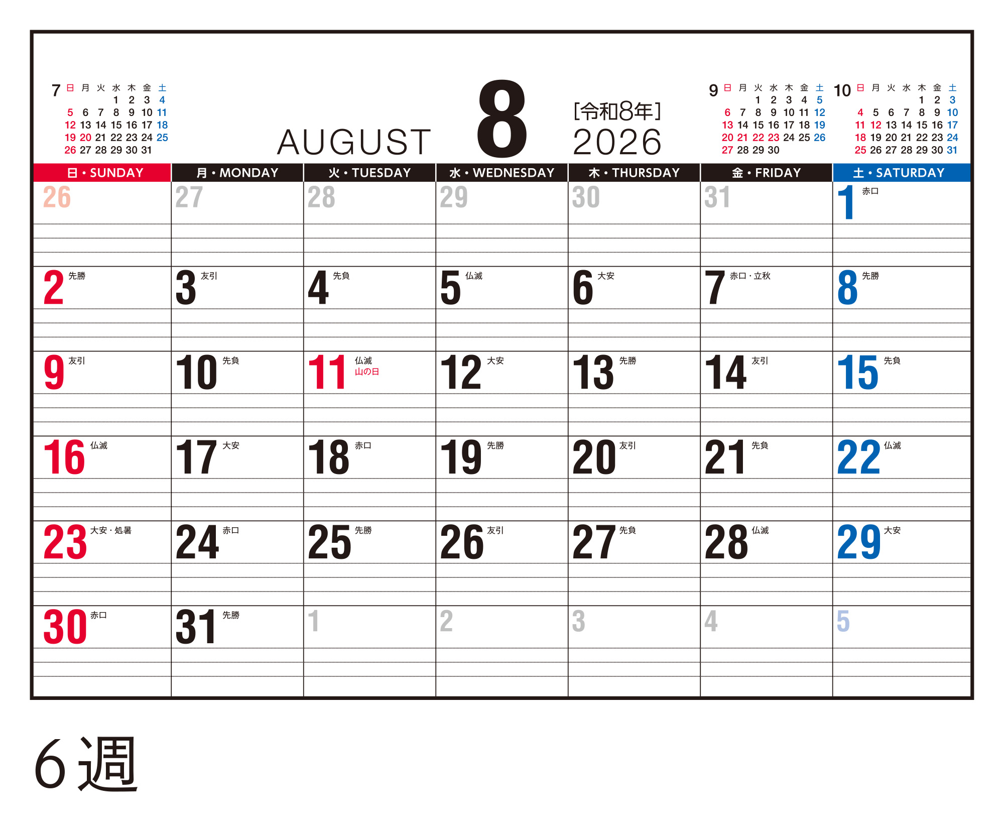 B5サイズのコンパクトな壁掛カレンダーとしても、大きめの卓上カレンダーとしてもお使いいただけます。裏面はフリーの横ケイメモスペースとTO DOリスト付き。その月の備忘録などにご活用いただけます。